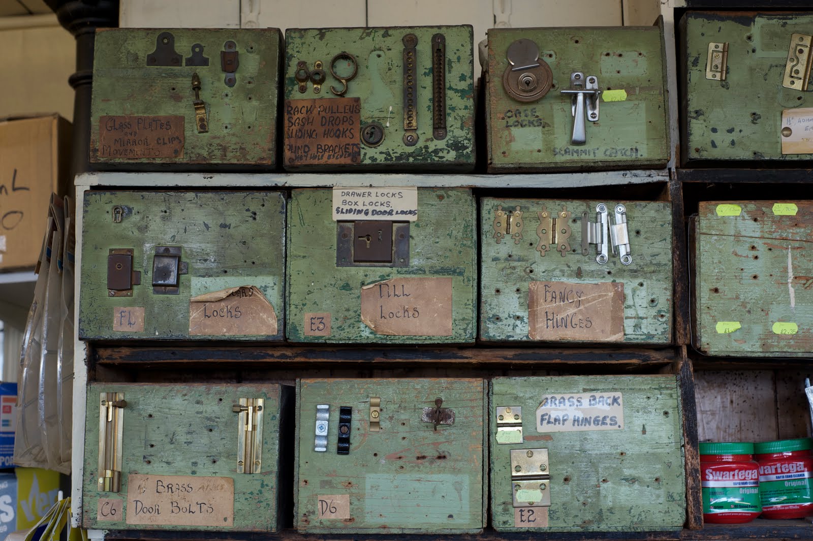 One of the first things you notice about the interior of Biggleston, besides the faint aroma of mothballs and paraffin that infuses all proper and longstanding hardware stores, is the vast array of boxes. Wooden and cardboard boxes of various sizes, containing all kinds of hardware necessities, climb up the shelves that cover the far wall and line all sides of a small room beyond. The most striking of these are the substantial wooden boxes, covered by a flakey, goose-shit-green paint, that sit at head height. The fronts of the boxes carry specimens of hardware as well as hand-written, brown paper labels which hint at each box’s contents: ‘Glass plates’; ‘Rack pulleys’; ‘Fancy Hinges’. The boxes were salvaged in the 1920s after the closure of the National Explosive Works at ‘Dynamite Towans’ on the edge of Hayle, which had employed over 1500 local workers at its height in WW1. The peeling paper labels were written and affixed by Mr Hodge, a previous proprietor of Biggleston. They don’t always predict accurately the box’s contents and some (‘D6’, ‘E3’, ‘F4’) are written entirely in a lost language of stock and storage. Even Ray Wyse, the present proprietor, is uncertain of their meaning. But, as Steve and I discover from our stay in this store, this hardly matters. These boxes, like the shop they fill, are valued less for their utility than for their significance as historical artifacts and carriers of collective memory.