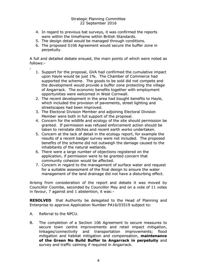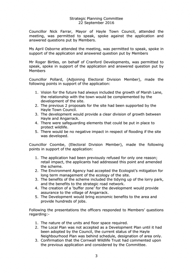Minutes extract SPC | PA16-03519 - HAYLE RETAIL PARK AND MARSH LANE NATURE RESERVE MARSH LANE HAYLE CORNWALL CRANFORD (HAYLE) LL