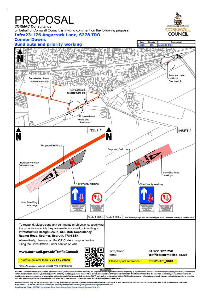 Documents showing the proposals may be inspected by appointment only at Cormac Reception, Radnor Road, Scorrier, Redruth, TR16 5EH. To make an appointment or obtain further information please telephone 01872 327250 during normal office hours. Alternatively, please email traffic@cormacltd.co.uk for further information.