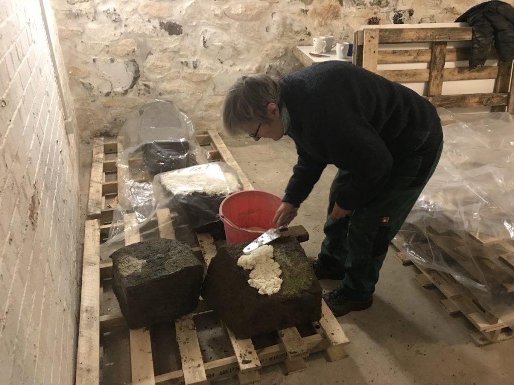 The Cunaide Stone after being moved inside the Heritage Centre. Sue is seen here applying paper pulp to absorb the moisture. Whilst many scholars have attempted to decipher the inscription over the years and answer the age-old local question – who was Cunaide? – we began our own investigations last week. Our volunteers worked with specialist stone conservators Kelland Conservation, in consultation with Historic England, to begin the mammoth task of cleaning the stone. The paper pulp, which had been absorbing the moisture from the stone since its rehousing, was removed and the four sections of stone steadily cleaned to reveal the inscription beneath.