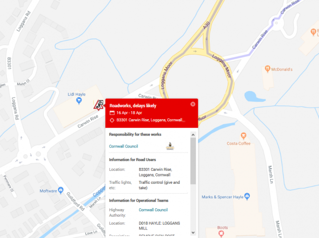 - 190415 | Roadworks | B3301 Carwin Rise, Loggans, Cornwall 16 April to 18 April | Delays likely | Traffic control (give & take)