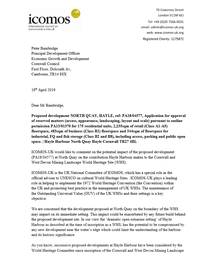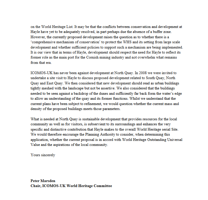 What is needed at North Quay is sustainable development that provides resources for the local community as well as for visitors, is subservient to its surroundings and enhances the very specific and distinctive contribution that Hayle makes to the overall WorldHeritage serial Site. We would therefore encourage the Planning Authority to consider, when determining this application, whether the current proposal is in accord with World Heritage Outstanding Universal Value and the aspirations of the local community.Yours sincerelyPeter MarsdenChair, ICOMOS-UK World Heritage Committee