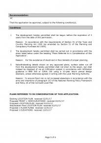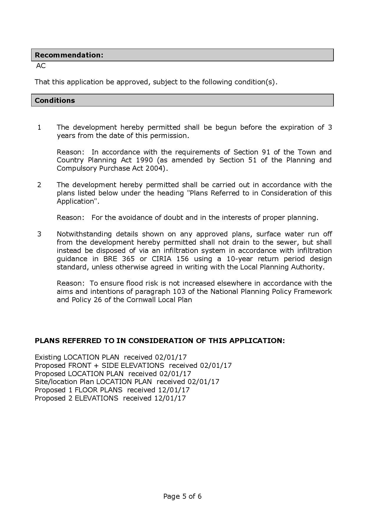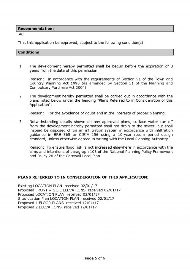 Conditions 1 The development hereby permitted shall be begun before the expiration of 3 years from the date of this permission. Reason: In accordance with the requirements of Section 91 of the Town and Country Planning Act 1990 (as amended by Section 51 of the Planning and Compulsory Purchase Act 2004). 2 The development hereby permitted shall be carried out in accordance with the plans listed below under the heading "Plans Referred to in Consideration of this Application". Reason: 3 For the avoidance of doubt and in the interests of proper planning. Notwithstanding details shown on any approved plans, surface water run off from the development hereby permitted shall not drain to the sewer, but shall instead be disposed of via an infiltration system in accordance with infiltration guidance in BRE 365 or CIRIA 156 using a 10-year return period design standard, unless otherwise agreed in writing with the Local Planning Authority. Reason: To ensure flood risk is not increased elsewhere in accordance with the aims and intentions of paragraph 103 of the National Planning Policy Framework and Policy 26 of the Cornwall Local Plan PLANS REFERRED TO IN CONSIDERATION OF THIS APPLICATION: Existing LOCATION PLAN received 02/01/17 Proposed FRONT + SIDE ELEVATIONS received 02/01/17 Proposed LOCATION PLAN received 02/01/17 Site/location Plan LOCATION PLAN received 02/01/17 Proposed 1 FLOOR PLANS received 12/01/17 Proposed 2 ELEVATIONS received 12/01/17 Page 5 of 6 Copies of decision notices and documents associated with the decision making process, where relevant, for the above applications can be found in the Council’s online planning register using the following link and by entering the reference of the application you are interested in. Link: http://planning.cornwall.gov.uk/online-applications/ Page 6 of 6
