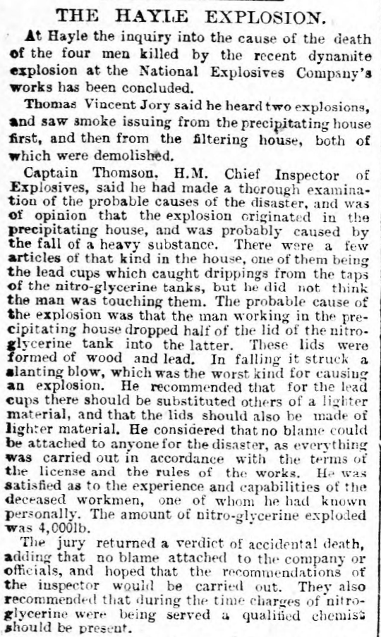 At Hayle the inquiry into the cause of the death of the four men killed by the recent dynamite explosion at the National Explosives Company's works has been concluded.