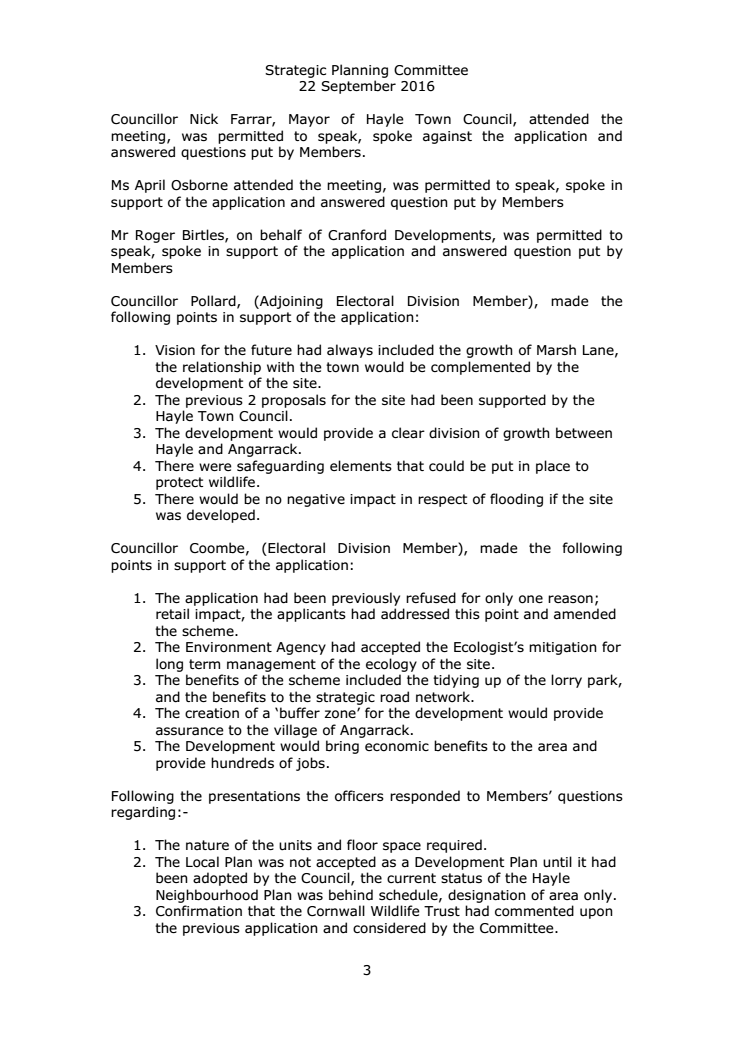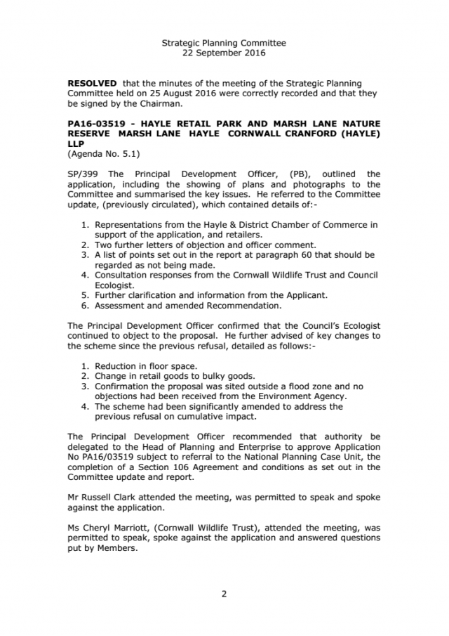 Minutes extract SPC | PA16-03519 - HAYLE RETAIL PARK AND MARSH LANE NATURE RESERVE MARSH LANE HAYLE CORNWALL CRANFORD (HAYLE) LL