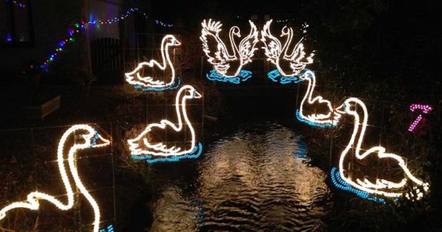Angarrack is a small village close to Hayle on the Atlantic coast of North Cornwall. The whole village takes part in a memorable animated display of the 12 Days of Christmas. The illuminations are scattered through the village: there are lights on the roof tops, on the walls, and even in the river!