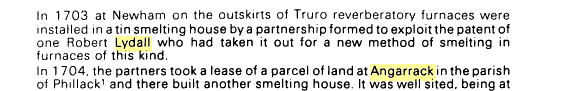 - 1705 | Mr Lyddell obtained patent for smelting tin in iron furnaces, and set up works at Angarrack