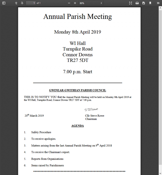 THIS IS TO NOTIFY YOU that the Annual Parish Meeting will be held on Monday 8thApril 2019 at the WI Hall, Turnpike Road, Connor Downs TR27 5DT at 7.00 p.m.