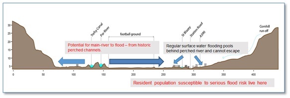 Part of the Reason Why There is a Flooding Problem in Par and St Blazey – Raised Channels above the Town in a Former Estuary – Cross Section of the Town at the Football Ground