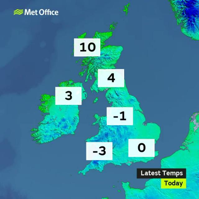 Monday night: "It will be clear and frosty in the west tonight, but with widespread fog and freezing fog developing elsewhere through the early hours. Turning frosty under the clear skies. Minimum temperature -4 °C".