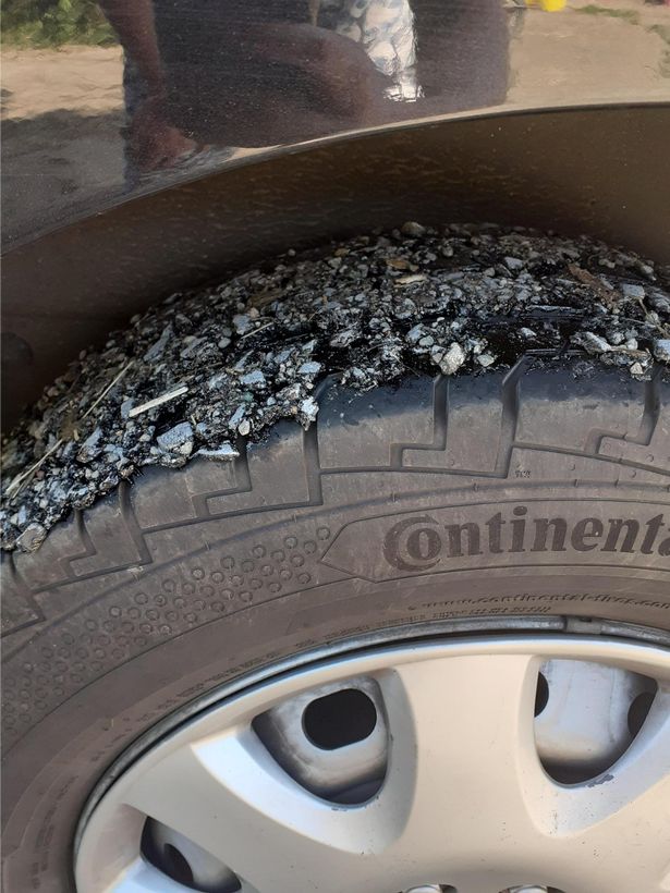 "Both passenger-side tyres were completely covered in melted Tarmac," she said. "I phoned my garage straight away and asked what to do.