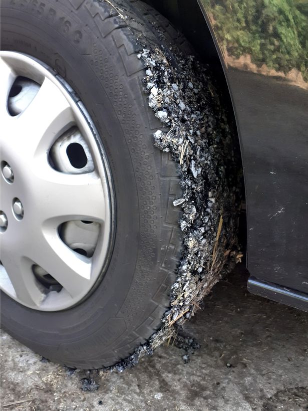 Louise said: "Both passenger-side tyres were completely covered in melted Tarmac" (Image: Louise Hanley / SWNS.COM)