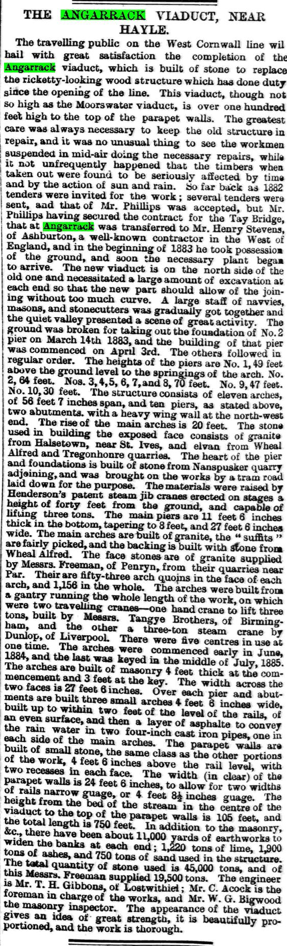 The travelling public on the West Cornwall line will hail with great satisfaction the completion of the Angarrack viaduct, which is built of stone to replace the ricketty-looking wood structure which has done duty since the opening of the line. This viaduct, though not so high as the Moorswater viaduct, is over one hundred feet high to the top of the papaet walls.