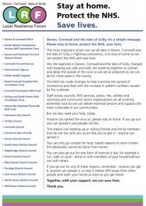 Open letter signed by LRF Devon, Cornwall and the Isles of Scilly, it’s a simple message - please stay at home, protect the NHS, save lives Communities across Devon, Cornwall and the Isles of Scilly are being Agencies tasked with stopping the virus in its tracks have written an Local authorities, NHS services, police, fire, utilities and voluntary Assistant Chief Constable Glen Mayhew, who chairs the LRF, said: “I know “The tactics are working. I know that people are getting frustrated and “We must persevere so that we can protect the NHS, contain and delay the spread of the virus, and save lives. “Members of the LRF are working tirelessly to deliver essential services “Anyone can catch the virus - anyone can spread the virus. So, by